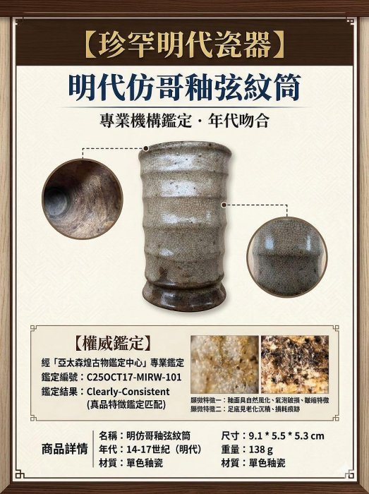 在追求品味的現代生活中,如何為居家環境增添一份獨特的藝術氣息,展現主人不凡的審美?一件精緻的古董擺件,往往能起到畫龍點睛的作用。今天,我們為您推薦的『明 仿哥釉弦紋小筒』,正是這樣一件能提升空間格調的絕佳選擇。 想像一下,在您的書桌一隅,或茶几之上,擺放這樣一只明代仿哥釉小筒,其溫潤的釉色與典雅的弦紋,瞬間為現代簡約的空間注入一股沉靜的東方古典韻味。它那『皮殼老到』的自然光澤,彷彿低聲訴說著歲月的故事,為您的家增添一份難以言喻的歷史深度與人文書卷氣息。而器表『自然開片』的冰裂紋路,更是獨一無二的藝術裝飾,每一個角度都散發著引人入勝的視覺魅力,令人百看不厭。 這件小筒不僅是視覺的享受,更是品味的象徵。更棒的是,它隨附『科學鑑定報告保真』,讓您在享受其藝術美感的同時,也對其歷史價值與收藏性充滿信心。無需擔心真偽,只需用心感受它為您的生活空間帶來的靜謐與雅致。現在就上Yahoo拍賣,讓這份跨越數百年的美,成為您家中一道獨特的風景線吧!