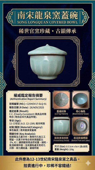 在瞬息萬變的收藏市場中,尋覓一件兼具藝術價值、歷史意義與保值增值潛力的珍品,是每位資深收藏家的夢想。這件【古董拍賣】南宋龍泉青瓷蓋碗,正是這樣一件不容錯過的稀世珍寶! 首先,其「南宋龍泉青瓷」的身份,本身就足以讓其在拍賣場上熠熠生輝。龍泉窯是宋代五大名窯之一,其作品以高雅脫俗的釉色和精湛的工藝聞名於世,深受當時皇室和文人雅士的追捧,存世量稀少。此蓋碗9.5cm的尺寸適中,蓮瓣紋飾經典,品相優良,完美展現了宋瓷的典型風格。 其次,也是最關鍵的賣點:本品附帶「元素分析科學保真」的權威認證!這意味著您不必再為古董的真偽而擔憂,科學數據為其南宋身份提供了無可辯駁的證明。這不僅大大降低了收藏風險,更是為其未來升值空間奠定了堅實基礎。在當今贋品充斥的市場,一件經過科學驗證的真品,其稀缺性和投資價值將會日益凸顯。 把握良機,為您的收藏添磚加瓦,或為後代傳承一份極具文化與財富價值的藝術資產。這不僅是一件器物,更是一份歷史的承諾,一份智慧的投資。立即前往Yahoo拍賣,競標這件博物館級的南宋龍泉青瓷蓋碗,成為它傳奇故事的下一位守護者!