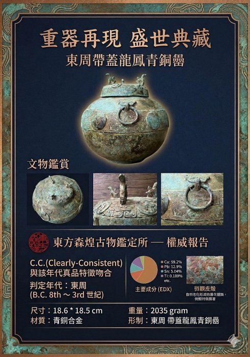 當歷史的塵埃輕輕拂去,留下的不僅是文字記載,更有那些穿越時空而來的物質文明。今天,我們將帶您深入探索一件極具藝術與歷史價值的【古董重器】東周/戰國龍鳳紋青銅缶,領略其背後所蘊藏的文化魅力。 這件青銅缶,誕生於東周與戰國交替的數百年歲月,一個思想百家爭鳴、社會劇烈變革的時代。此時期的青銅器,擺脫了西周的莊重肅穆,轉而呈現出更為自由、生動的藝術風格。其上浮雕的『龍鳳紋』,線條流暢,構圖巧妙,不僅展現了戰國時期精湛的鑄造工藝,更深刻反映了當時人們對祥瑞、權力與永恆的追求。龍與鳳,作為中國傳統文化中最重要的神獸,在此器物上交織,構成一幅寓意吉祥、力量與尊貴的宏偉畫面。 重達2035克的實體,傳達著青銅器作為禮器或盛器的厚重與莊嚴。而最令人安心的是,這件精品附有『元素分析鑑定報告』,用現代科技為其古老身份提供鐵證,徹底保證了其真品無疑。這讓它不單單是一件精美的古物,更是我們研究東周/戰國歷史、藝術、宗教及社會風貌的重要實物資料。擁有它,便是擁有一段活生生的歷史。誠邀您透過Yahoo拍賣,將這份跨越千年的藝術與歷史寶藏納入珍藏。